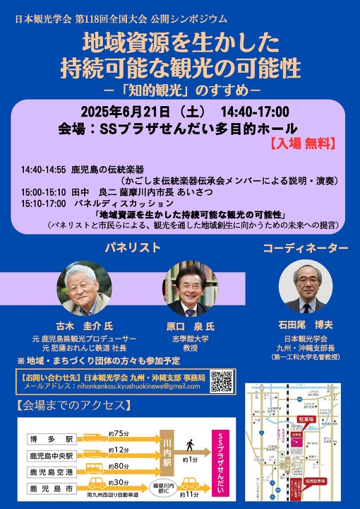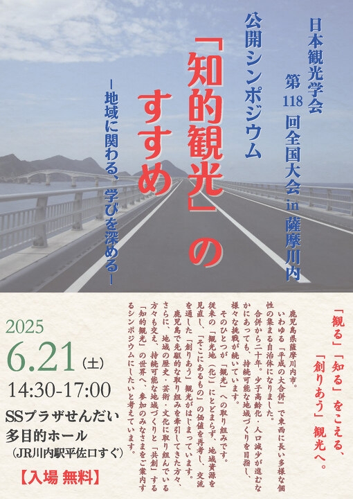 日本観光学会第118 回全国大会をSSプラザせんだい(薩摩川内市川内駅コンベンションセンター・鹿児島県薩摩川内市)において開催することになりました。